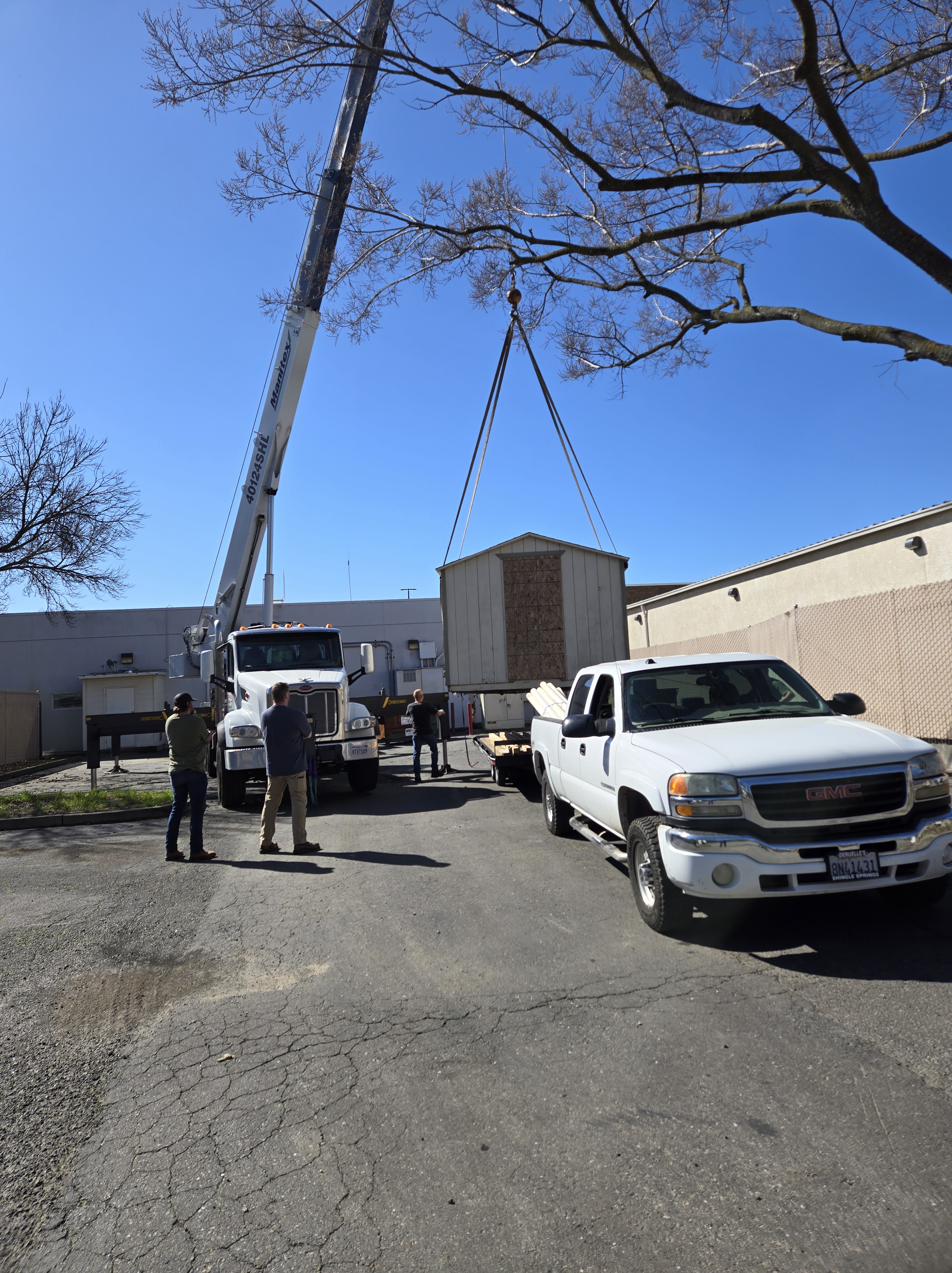 If the shed is not accessible for some reason we can hire a crane to pick the shed and load it on to our trailer! The crane can reach up too 75 feet out!