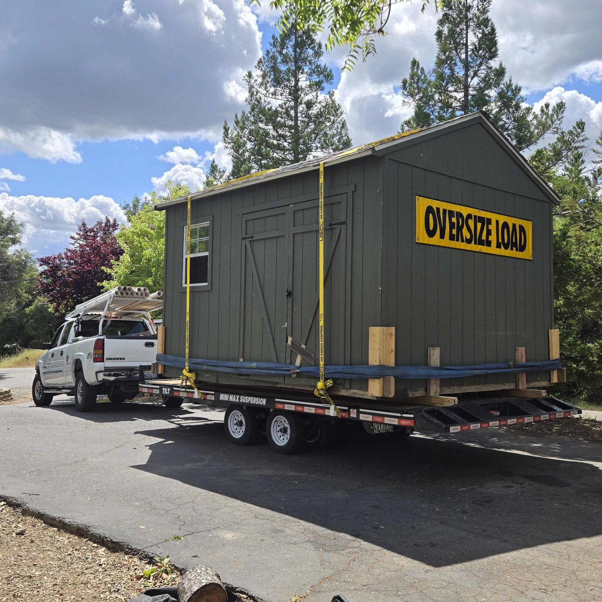 We move sheds as our main specialty, house to house or just in your backyard. We use a 17 foot deckover tilt trailer with a 12,000 LBS winch to load up the sheds. And to haul we use a 2003 GMC Sierra 2500 6.0L.